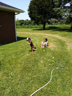 Wyatt is playing in the "worm" sprinkler with Beth and Luke. He loved it! He laughed, clapped his hands and screamed with delight!